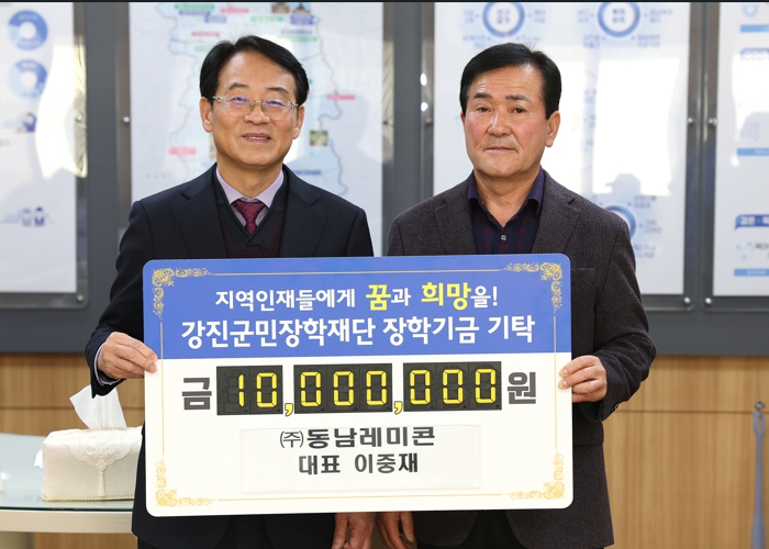 27일 강진군에 따르면 강진군 칠량면에 있는 (주)동남레미콘 이중재 대표가 지난 23일 강진군 지역 사회에 기여하기 위해 1,000만 원의 장학금을 기탁했다.