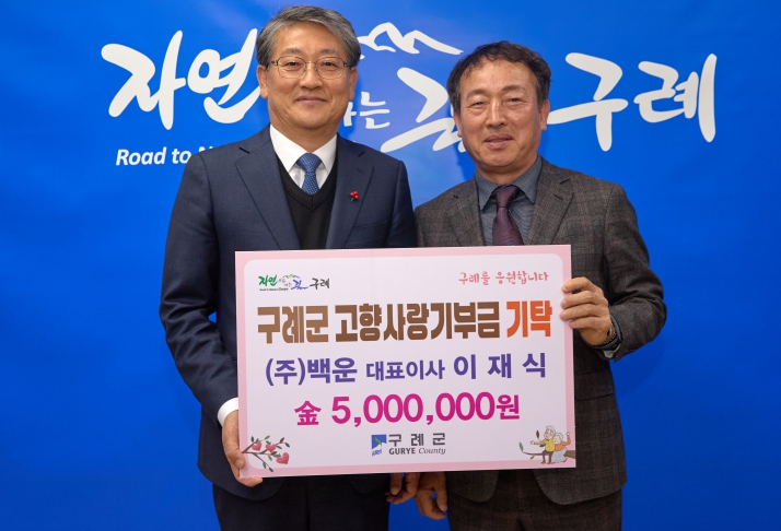 김순호 군수는 “고향을 위해 따뜻한 나눔을 실천해 준 이재식 대표께 감사드린다”며 “기부금은 구례 군민과 지역발전을 위해 소중히 사용하겠다”고 말했다.