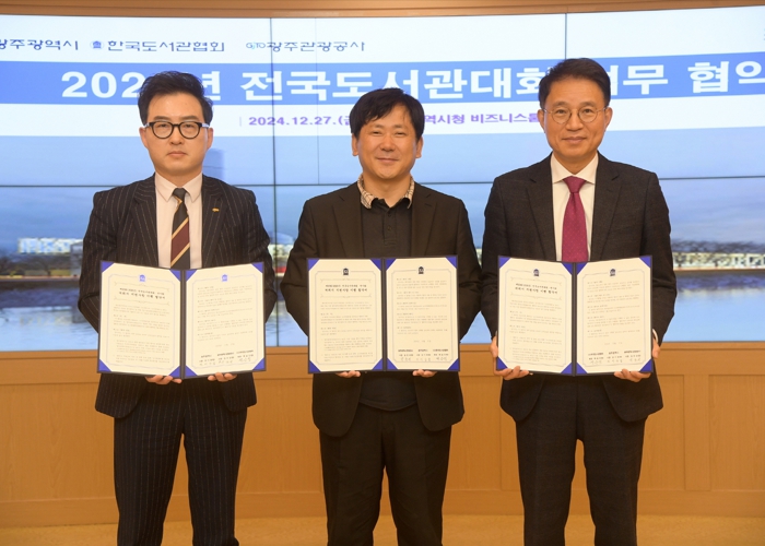 광주광역시는 27일 시청 비즈니스룸에서 한국도서관협회, 광주관광공사와 ‘제63회 전국도서관대회‧전시회 개최지 지원사항 이행 협약’을 체결했다.