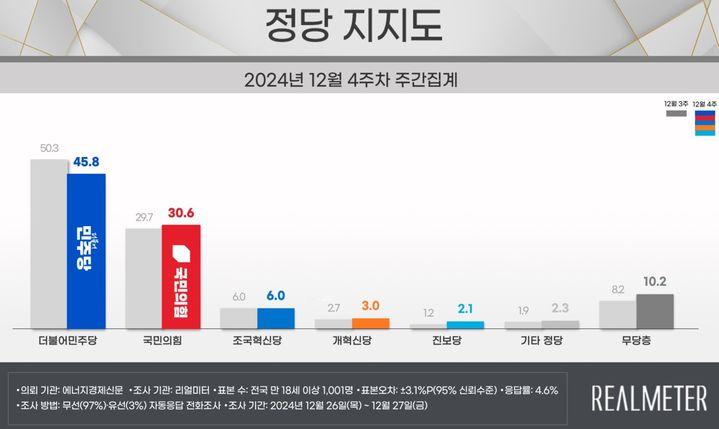 반면 민주당은 4.5%p 하락했다. 12월 2주차에 52.4%를 기록해 윤석열 정부 이래 최고치를 경신했으나 2주 연속 지지율 하락세가 나타났다. 양당 간 지지율 격차는 15.2%p로 14주째 오차범위(±3.1%p)밖이다.