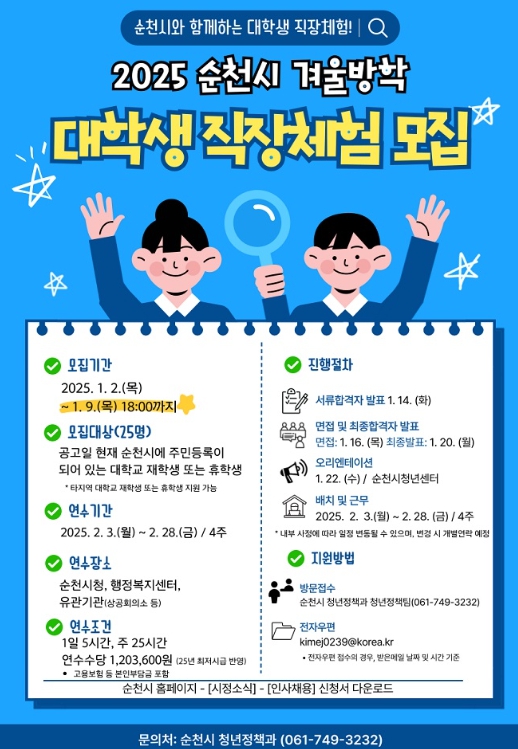 최종합격자는 순천시청과 행정복지센터, 사전에 신청한 유관기관에 배치되어 2025년 2월 3일부터 2월 28일까지 4주 동안 하루 5시간씩 근무하게 된다.