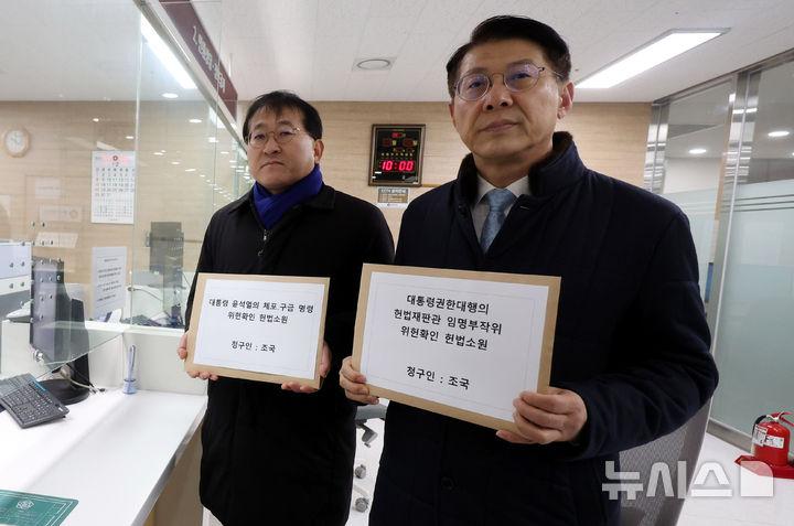 조 전 대표 측 대리인 김형연 변호사와 차규근 조국혁신당 의원은 31일 오전 서울 종로구 헌법재판소에 2건의 헌법소원 심판 청구서를 접수했다.