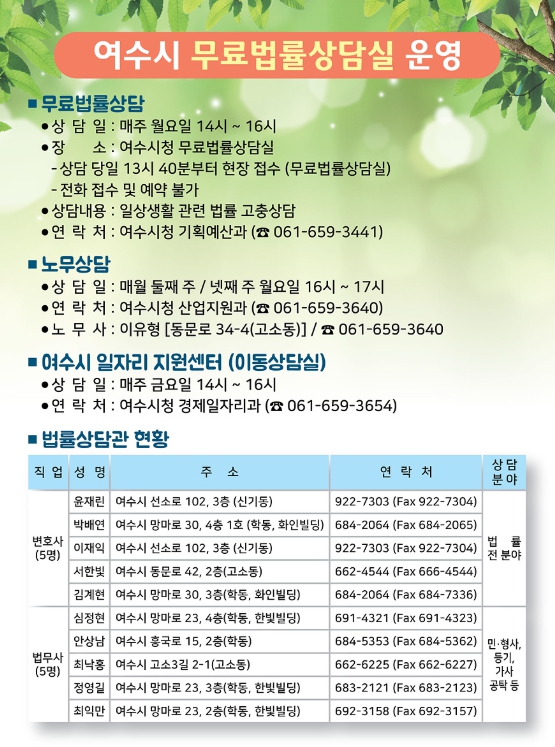 상담 범위는 부동산, 상속, 채권·채무, 이혼 등 민사·형사·가사·행정사건 및 여수시 행정처분에 관한 사항이다.