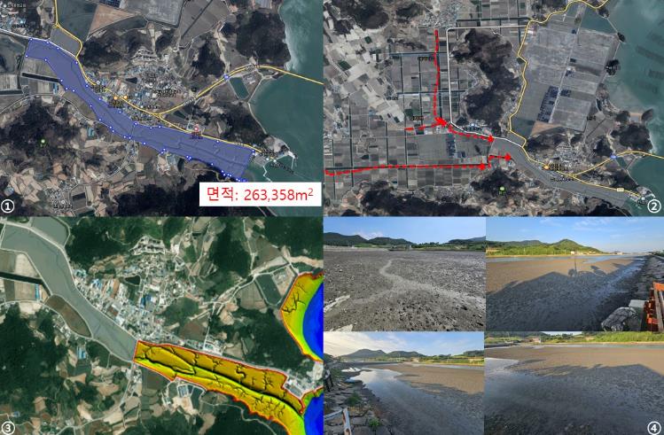 이를 충족하는 갯벌의 물리적 지형구조는 조금 때는 밀물이 차오르지 않으나, 백중사리 때는 최대 수위로부터 갯벌 바닥까지 깊이가 1.8m 이내인 갯벌이 최적지로 나타났다.