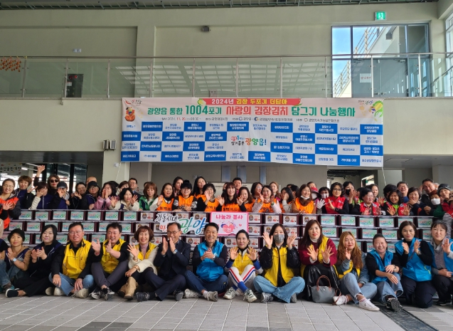올해 행사는 ‘2024년 광양읍 통합 1004포기 사랑의 김장김치 나눔’으로 확대 추진해 43개 단체·260여 명의 개인이 김장부터 배달까지 현장 나눔 실천에 동참했다.