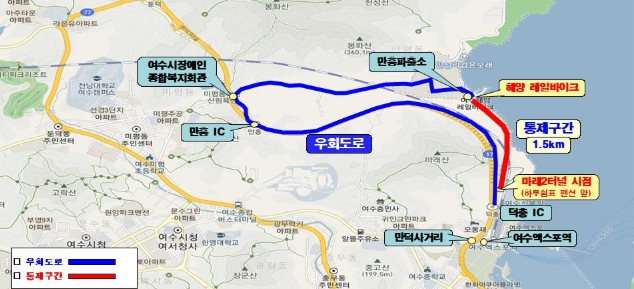 공사 기간 여수엑스포역~만성리․오천동 방면 통행은 여수엑스포역~덕충IC~만흥IC~여수시장애인종합복지관~만성리해수욕장 방면으로 우회해야 한다.
