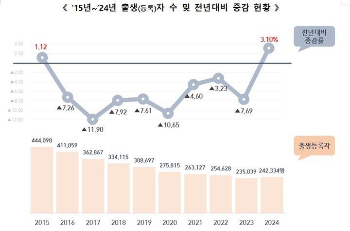 행정안전부는 2024년 주민등록 인구통계 분석 결과 2024년 출생(등록)자 수가 24만2334명으로 집계됐다고 3일 밝혔다.