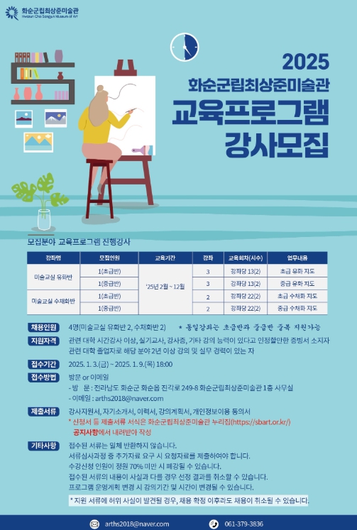 접수 방법은 화순군립최상준미술관 누리집 공지 사항에서 제출 서류 양식을 다운받아 작성 후, 방문 및 이메일로 접수하면 된다.