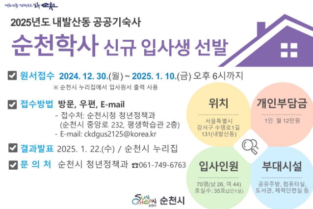 순천학사 입사서류는 순천시 청년정책과로 방문, 등기우편 또는 이메일을 통해 오는 10일 오후 6시까지 제출해야 하며, 최종합격자는 오는 22일에 발표될 예정이다.
