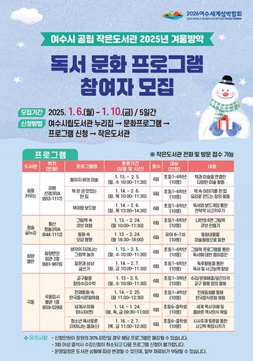 참여 희망자는 여수시립도서관 누리집에서 온라인 신청하거나 해당 작은도서관으로 전화 또는 방문 신청하면 되며, 각 프로그램은 10명씩 선착순 마감된다.