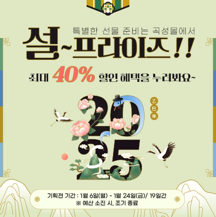 곡성몰 관계자는 “설 명절을 맞아 고객들에게 더 큰 만족을 드릴 수 있도록 다양한 이벤트와 할인 행사를 준비했으니 따뜻하고 풍성한 설 명절을 보내시길 바란다”라고 밝혔다.
