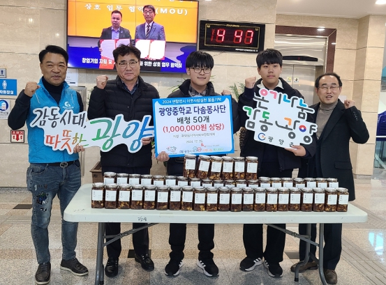 허형채 민간위원장은 “광양중학교 학생들의 지역 어르신을 향한 따뜻한 마음이 감동적이고 학생 여러분과 이웃을 위한 나눔의 기회를 가져 뜻깊다. 건강식품은 대상 가구에 잘 전달해 이들의 건강한 겨울나기를 지원하겠다”고 전했다.