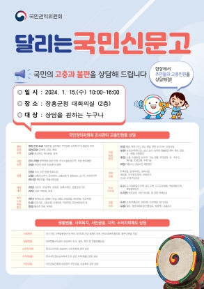 장흥군에서 열리는 이번 ‘달리는 국민신문고’에서는 국민권익위원회 조사관 및 협업기관 전문가 20여명이 참여하여 상담을 진행할 예정이다.