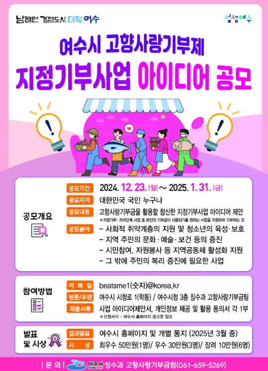 시 관계자는 “지정기부사업은 기부자가 원하는 사업을 선택해 기부하는 방식으로 추진된다”며 “여수시에 적합하고 기부자의 공감을 이끌어낼 참신한 아이디어를 기대한다”고 말했다.