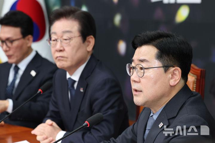 박찬대 원내대표는 이날 서울 여의도 국회에서 열린 원내대책회의에서 "내일 국회 본회의에서 특검법 재의결이 예정돼 있다. 내란수사특검법에 대한 입장은 민주 정당이냐 위헌 정당이냐를 가르는 시금석이 될 것"이라며 "내란 진압을 위해 특검을 신속히 출범시켜야 한다"고 했다.