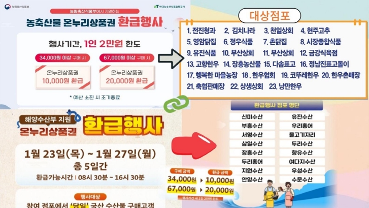 이번 온누리상품권 환급행사는 농림축산식품부와 해양수산부에서 주관하며 정남진장흥토요시장 내 환급행사 대상 점포는 총 39개소로 농축산물 23개소, 수산물 16개소이다.