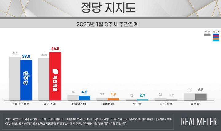 여론조사 전문회사 리얼미터가 에너지경제신문 의뢰로 지난 16~17일(1월 3주차) 이틀간 전국 18세 이상 유권자 1004명을 대상으로 한 정당 지지도 조사에 따르면 국민의힘은 46.5%, 민주당은 39%로 집계됐다.