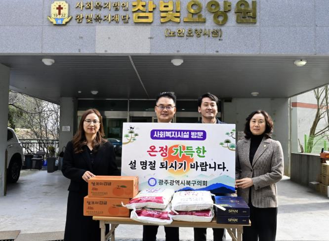 이날 북구의회 의원들은 장애인 거주시설인 늘푸른공동생활가정(문흥동 소재)과 노인요양시설인 참빛요양원(운암동 소재)을 각각 방문하여 온누리상품권, 백미, 명절선물세트 등의 위문품을 전달했다.
