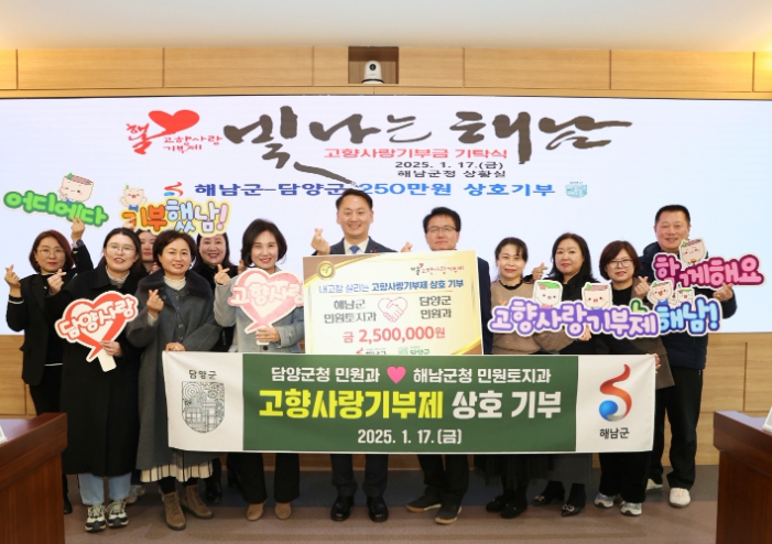 이병노 담양군수는 “고향사랑기부제 상호기부가 추진될 수 있도록 뜻을 모아준 직원들과 해남군 관계자분들에게 감사의 마음을 전한다”라며 “이번 상호기부를 계기로 두 지자체 간의 돈독한 우정과 따뜻한 동행이 계속 이어지기를 바란다”라고 전했다.