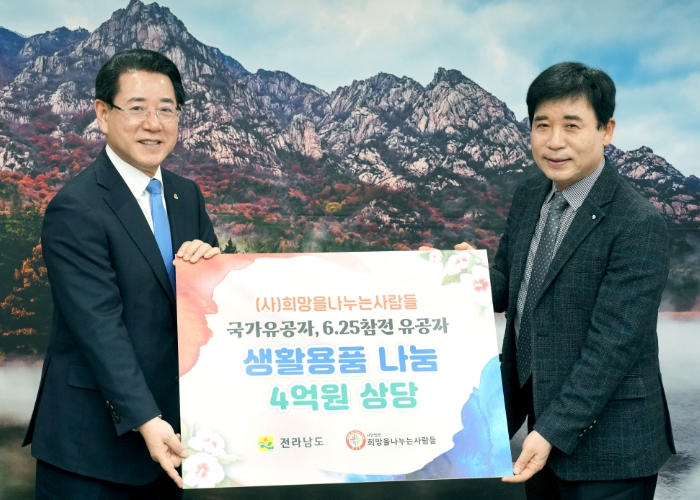 이날 전남도청에서 열린 기탁식에는 김영록 전남도지사, 김정안 (사)희망을 나누는 사람들 회장, 강성휘 전남사회서비스원장, 이연득 상이군경회 전남도지부장, 김춘일 6·25참전유공자회 전남도지부장 등이 참석했다.