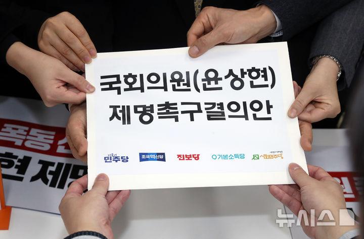 박성준 민주당 원내수석부대표와 강유정 민주당 원내대변인, 정춘생 조국혁신당 원내수석부대표, 전종덕 진보당 의원, 한창민 사회민주당 공동대표, 용혜인 기본소득당 대표는 21일 서울 여의도 국회 의안과에 윤 의원 제명 촉구 결의안을 제출했다.