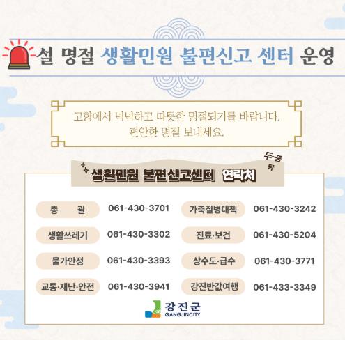 강진원 강진군수는 “빈틈없는 설 연휴 생활민원 불편신고센터 운영으로 군민과 귀성객들이 안전하고 편안한 명절이 되도록 최대한 편의를 제공하겠다”며 “고향에서 넉넉하고 따뜻한 정을 느끼는 설 명절이 되도록 만전의 준비를 하겠다”고 말했다.