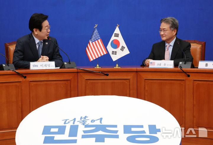 이 대표는 이날 국회 본청 당대표실에서 조셉 윤 주한 미국대사대리를 만나 "트럼프 제47대 미국 대통령의 취임을 진심으로 축하드린다"며 "윤 대사대리가 국회, 민주당을 방문했기 때문에 앞으로 한미 관계가 더욱 더 돈독하게 될 것으로 믿는다"고 말했다.