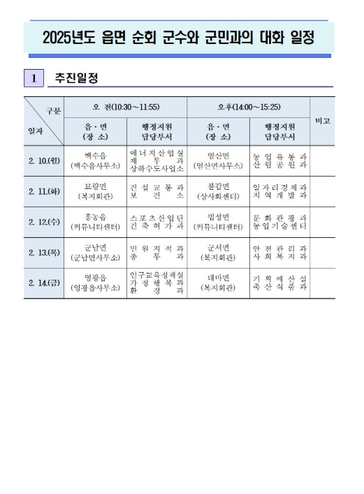 민선8기 2025년'군수와 군민과의 대화'는 ▲2. 10. 백수읍, 염산면 ▲2. 11. 묘량면, 불갑면 ▲2. 12. 홍농읍, 법성면 ▲2. 13. 군남면, 군서면 ▲2. 14. 영광읍, 대마면 순으로 진행되며, 도서지역인 낙월면 군민과의 대화는 별도 일정을 잡아 추진할 계획이다.