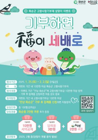 구복규 화순군수는 “이번 이벤트는 설 명절을 맞아 지난해 화순군에 관심을 두고 기부에 동참해 주신 분들에게 감사의 마음을 전하고, 고향을 방문하는 출향인들과 따뜻한 마음을 함께 나누기 위해 마련했다.”라고 전했다.
