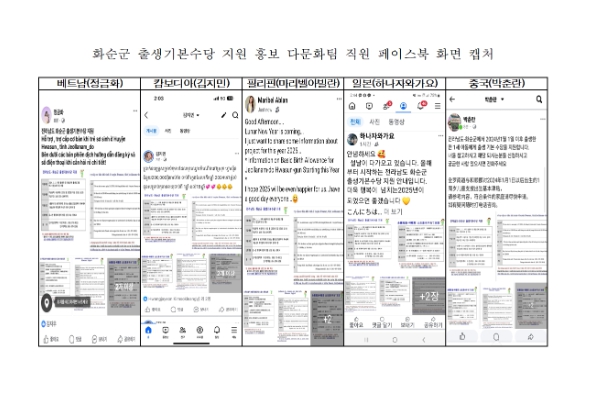 화순군은 홍보와 이해 부족으로 다문화가족들이 혜택을 놓치는 사례가 없도록 출생기본수당 지원정책과 관련한 내용을 베트남·캄보디아·필리핀·일본·중국 5개 국어로 번역하여 SNS 홍보에 나섰다.