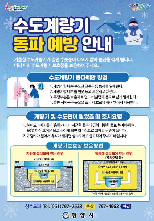 상수도 동파 및 누수 사고로 인한 불편 사항은 광양시 상수도과로 신고하면 된다.