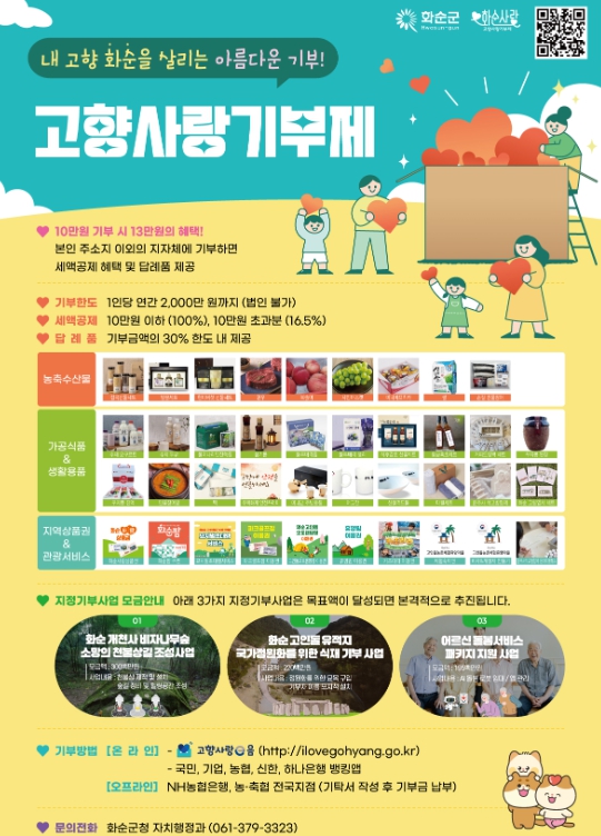 고향사랑기부제 지정기부는 기부자가 자신의 기부금이 쓰이길 원하는 분야나 사업을 직접 선택할 수 있는 제도로 화순군 지정기부 사업으로는 ▲화순 고인돌유적지 국가정원화를 위한 식재기부 ▲개천사 비자나무숲 천불상길 조성 ▲어르신 돌봄서비스 패키지 지원 3개 사업이 있다.
