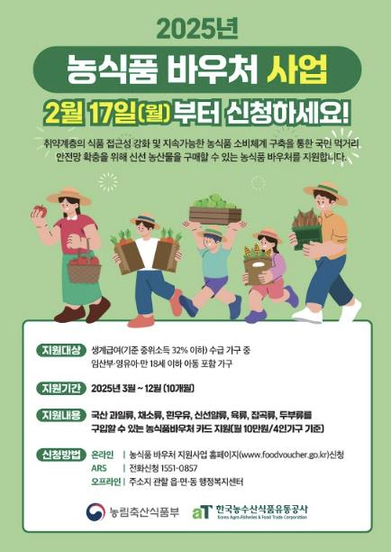 시 관계자는 “이번 농식품 바우처 지원사업을 통해 저소득층의 건강한 식생활을 돕고, 지역 농산물 소비 촉진에도 기여할 것으로 기대한다”며, “대상자들이 빠짐없이 혜택을 받을 수 있도록 사업 홍보에 최선을 다하겠다”고 밝혔다.