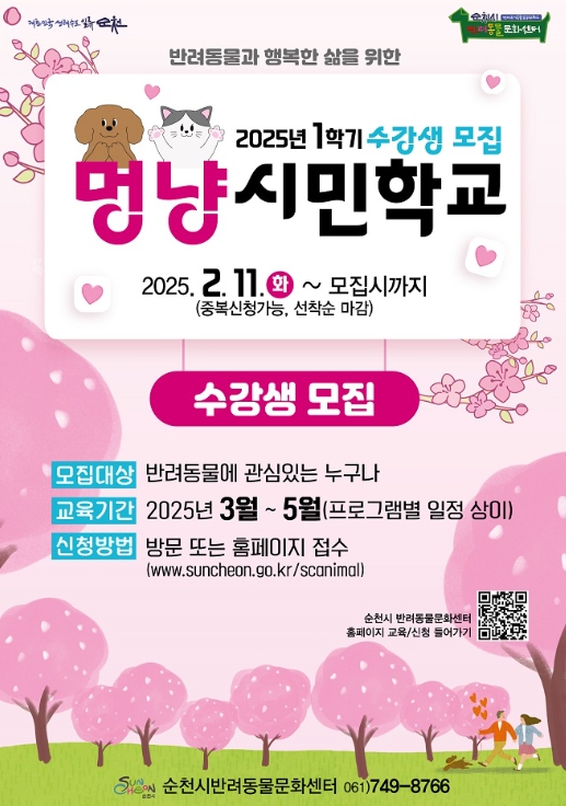 강좌 신청은 오는 11일부터 ‘순천시 반려동물문화센터 누리집과 반려동물문화센터 방문을 통해 선착순으로 받는다.