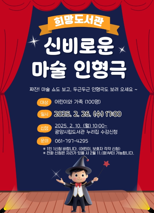 이번 공연은 어린이와 가족 누구나 무료로 관람 가능하며, 2월 10일 오전 10시부터 광양시립도서관 누리집 에서 사전 신청할 수 있다. 자세한 사항은 광양희망도서관으로 문의하면 된다.