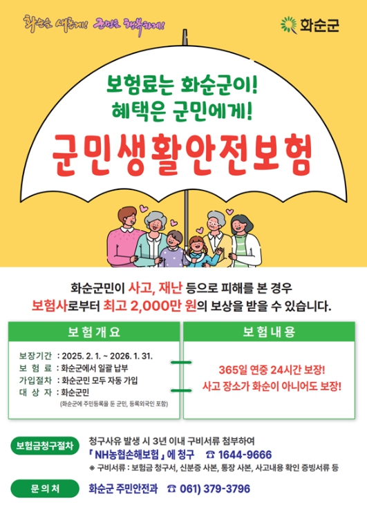 군민생활안전보험은 화순군에 주민등록을 둔 군민(등록외국인 포함)을 대상으로 별도 가입 절차는 없으며, 보험기간 중 보험금 지급 사유 발생 시 혜택받을 수 있다. 사고 발생 지역은 국내·국외 지구촌 어디든지 해당하고, 타 보험에 가입돼 있어도 중복보장이 가능하다.