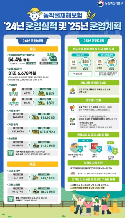 특히 올해부터는 과수 4종의 보장방식이 기존에 열매를 솎아내는 적과 전 모든 자연재해 보장, 적과 후 특정 재해를 보장하는 방식에서, 수확기까지 폭염 등 모든 자연재해 피해를 보장받도록 확대됐다.