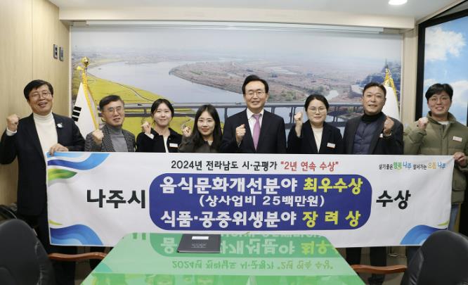 나주시는 음식문화개선을 위해 발굴한 정책 추진 성과에 힘입어 2023년 장려상에 이어 2024년 전라남도 음식문화개선 업무 실적 평가에서 최우수상을 수상하며 총 상사업비 3500만원을 확보하는 결실을 이뤘다.