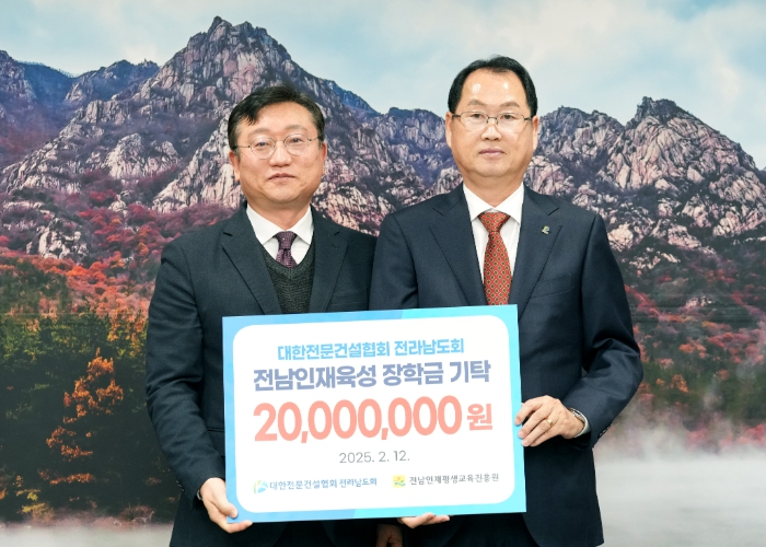 이날 전남도청에서 열린 기탁식에는 명창환 전남도 행정부지사, 대한전문건설협회 강성진 전남도회장과 서배실 수석부회장, 범희승 전남인재평생교육진흥원장, 문인기 전남도 건설교통국장 등이 참석했다.