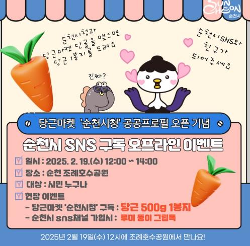 이벤트는 시에서 운영하는 SNS 채널 2개 이상을 구독한 시민에게는 마스코트 ‘루미뚱이’ 그립톡을 증정하며, 당근마켓에서 ‘순천시청’과 단골을 맺으면 순천에서 수확한 신선한 당근을 증정할 예정이다.
