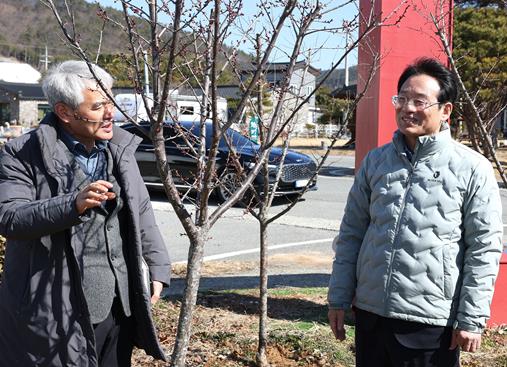 군수의 마음을 알 턱이 없는 새 봄맞이 전령사 홍매화, 활짝 필 기미가 없다.