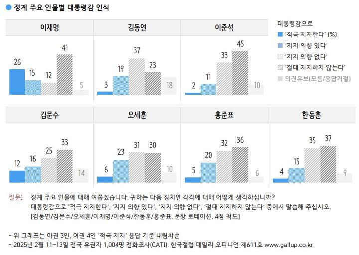 한편 한국갤럽이 '장래 대통령감으로 누구를 지지(적극 지지한다+지지 의향 있다)하거나 반대(지지 의향 없다+절대 지지하지 않는다)하는지' 물은 결과 이재명 대표는 지지 41%:반대 53%를, 김문수 장관은 지지 28%: 반대 58%를 기록했다.