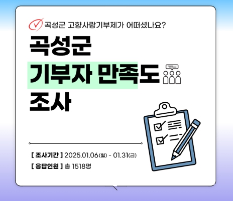 곡성군에 따르면 이번 설문조사는 2024년 곡성군 고향사랑기부제 참여 경로, 지정기부, 답례품에 대한 선호도와 만족도, 기부자 및 잠재 기부자의 의견 등을 듣고자 마련됐다.