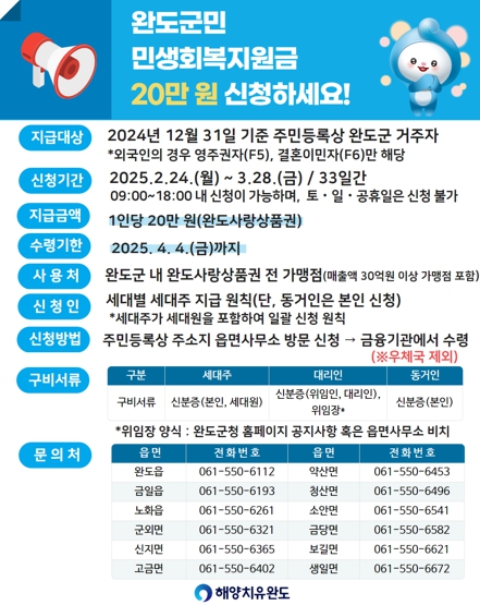민생회복지원금 신청 대상은 2024년 12월 31일 기준 주민등록상 완도군에 주소를 둔 군민이고, 외국인의 경우 영주권자(F5), 결혼 이민자(F6)만 해당된다.