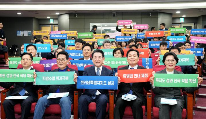신정훈 국회 행정안전위원장은 "특별자치도는 지방소멸 위기를 딛고 전남이 되살아나기 위한 제도적 시작점으로, 실질적 지방분권을 실현하는 가장 효과적 방법 중 하나"라며 "특별법 국회 통과에 최선을 다하겠다"고 밝혔다.