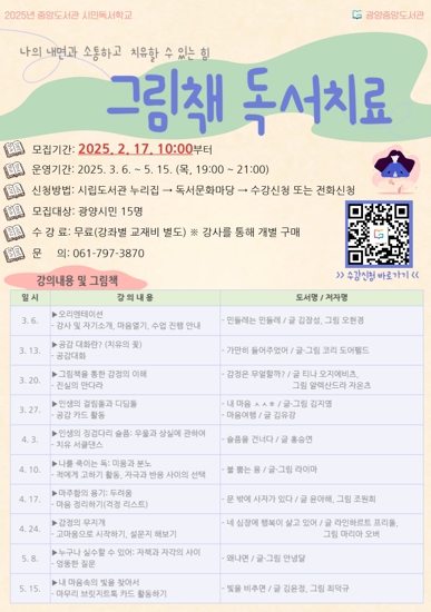 ‘그림책 독서치료’는 차시별로 선정된 그림책을 함께 읽고, 다양한 독후 활동을 통해 자신의 내면을 탐색하는 치유 프로그램이다. 책 속 이야기와 감정을 나누며 자신을 돌아보고, 타인과의 공감을 통해 정서적 치유와 성장을 경험할 것으로 기대된다.