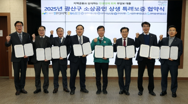 광산구는 17일 광주신용보증재단, 농협은행, 광주어룡신협, 광주하남신협, 우산신협, 서광주새마을금고, 한마을새마을금고와 소상공인 상생 특례보증 업무협약(MOU)을 체결했다.