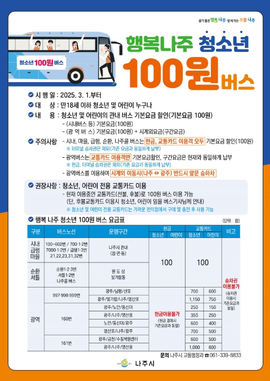 ‘행복 나주 청소년 100원 버스’ 정책에 대한 세부 사항은 나주시청 누리집 또는 읍·면·동 행정복지센터, 각급 학교에서 확인할 수 있다.