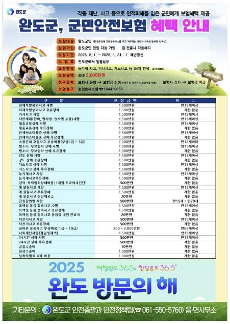 ‘군민 안전 보험’은 예상치 못한 각종 재해 및 사고로부터 피해를 입은 군민에게 보험급을 지원하여 생활 안정을 도모하고자 2018년부터 시행해 오고 있다.