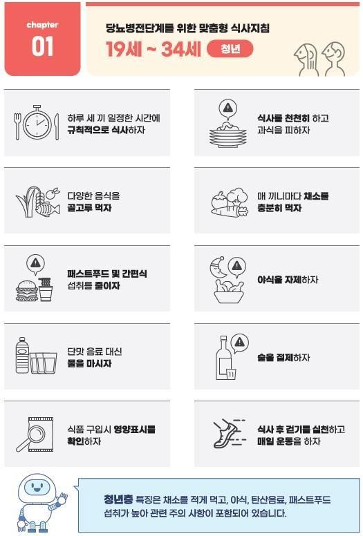 가이드에서는 청년층(19~34세)에 해당한다면 야식, 패스트푸드 및 간편식 섭취를 줄이고 단맛이 강한 음료 대신 물을 마시기를 권장하는 등 연령별(청·중·장·노년층) 당뇨병 전(前)단계를 위한 식사지침을 제시한다.
